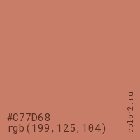 Цвет #C77D68 в цветовой модели RGB обозначается тремя октетами (199, 125, 104) в десятичном формате и #C77D68 в шестнадцатиричном (hex) формате, которые являются интенсивностью красного 199 (hex C7), интенсивность зелёного 125 (hex 7D) и интенсивность синего 104 (hex 68).