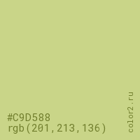 Цвет #C9D588 в цветовой модели RGB обозначается тремя октетами (201, 213, 136) в десятичном формате и #C9D588 в шестнадцатиричном (hex) формате, которые являются интенсивностью красного 201 (hex C9), интенсивность зелёного 213 (hex D5) и интенсивность синего 136 (hex 88).