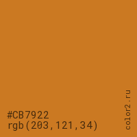 Цвет #CB7922 в цветовой модели RGB обозначается тремя октетами (203, 121, 34) в десятичном формате и #CB7922 в шестнадцатиричном (hex) формате, которые являются интенсивностью красного 203 (hex CB), интенсивность зелёного 121 (hex 79) и интенсивность синего 34 (hex 22).