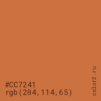Цвет #CC7241 в цветовой модели RGB обозначается тремя октетами (204, 114, 65) в десятичном формате и #CC7241 в шестнадцатиричном (hex) формате, которые являются интенсивностью красного 204 (hex CC), интенсивность зелёного 114 (hex 72) и интенсивность синего 65 (hex 41).