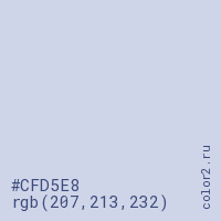 Цвет #CFD5E8 в цветовой модели RGB обозначается тремя октетами (207, 213, 232) в десятичном формате и #CFD5E8 в шестнадцатиричном (hex) формате, которые являются интенсивностью красного 207 (hex CF), интенсивность зелёного 213 (hex D5) и интенсивность синего 232 (hex E8).