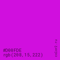 Цвет #D00FDE в цветовой модели RGB обозначается тремя октетами (208, 15, 222) в десятичном формате и #D00FDE в шестнадцатиричном (hex) формате, которые являются интенсивностью красного 208 (hex D0), интенсивность зелёного 15 (hex 0F) и интенсивность синего 222 (hex DE).