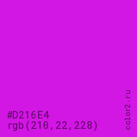 Цвет #D216E4 в цветовой модели RGB обозначается тремя октетами (210, 22, 228) в десятичном формате и #D216E4 в шестнадцатиричном (hex) формате, которые являются интенсивностью красного 210 (hex D2), интенсивность зелёного 22 (hex 16) и интенсивность синего 228 (hex E4).