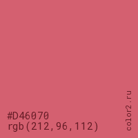 Цвет #D46070 в цветовой модели RGB обозначается тремя октетами (212, 96, 112) в десятичном формате и #D46070 в шестнадцатиричном (hex) формате, которые являются интенсивностью красного 212 (hex D4), интенсивность зелёного 96 (hex 60) и интенсивность синего 112 (hex 70).