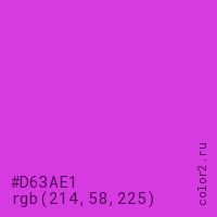 Цвет #D63AE1 в цветовой модели RGB обозначается тремя октетами (214, 58, 225) в десятичном формате и #D63AE1 в шестнадцатиричном (hex) формате, которые являются интенсивностью красного 214 (hex D6), интенсивность зелёного 58 (hex 3A) и интенсивность синего 225 (hex E1).