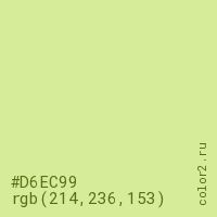 Цвет #D6EC99 в цветовой модели RGB обозначается тремя октетами (214, 236, 153) в десятичном формате и #D6EC99 в шестнадцатиричном (hex) формате, которые являются интенсивностью красного 214 (hex D6), интенсивность зелёного 236 (hex EC) и интенсивность синего 153 (hex 99).