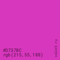 Цвет #D737BC в цветовой модели RGB обозначается тремя октетами (215, 55, 188) в десятичном формате и #D737BC в шестнадцатиричном (hex) формате, которые являются интенсивностью красного 215 (hex D7), интенсивность зелёного 55 (hex 37) и интенсивность синего 188 (hex BC).