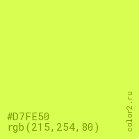 Цвет #D7FE50 в цветовой модели RGB обозначается тремя октетами (215, 254, 80) в десятичном формате и #D7FE50 в шестнадцатиричном (hex) формате, которые являются интенсивностью красного 215 (hex D7), интенсивность зелёного 254 (hex FE) и интенсивность синего 80 (hex 50).