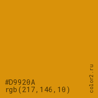 Цвет #D9920A в цветовой модели RGB обозначается тремя октетами (217, 146, 10) в десятичном формате и #D9920A в шестнадцатиричном (hex) формате, которые являются интенсивностью красного 217 (hex D9), интенсивность зелёного 146 (hex 92) и интенсивность синего 10 (hex 0A).
