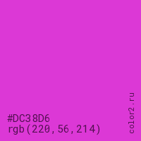 Цвет #DC38D6 в цветовой модели RGB обозначается тремя октетами (220, 56, 214) в десятичном формате и #DC38D6 в шестнадцатиричном (hex) формате, которые являются интенсивностью красного 220 (hex DC), интенсивность зелёного 56 (hex 38) и интенсивность синего 214 (hex D6).