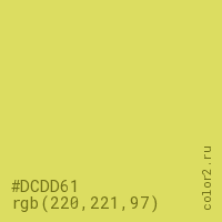Цвет #DCDD61 в цветовой модели RGB обозначается тремя октетами (220, 221, 97) в десятичном формате и #DCDD61 в шестнадцатиричном (hex) формате, которые являются интенсивностью красного 220 (hex DC), интенсивность зелёного 221 (hex DD) и интенсивность синего 97 (hex 61).