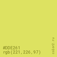Цвет #DDE261 в цветовой модели RGB обозначается тремя октетами (221, 226, 97) в десятичном формате и #DDE261 в шестнадцатиричном (hex) формате, которые являются интенсивностью красного 221 (hex DD), интенсивность зелёного 226 (hex E2) и интенсивность синего 97 (hex 61).