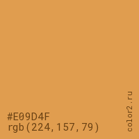 Цвет #E09D4F в цветовой модели RGB обозначается тремя октетами (224, 157, 79) в десятичном формате и #E09D4F в шестнадцатиричном (hex) формате, которые являются интенсивностью красного 224 (hex E0), интенсивность зелёного 157 (hex 9D) и интенсивность синего 79 (hex 4F).