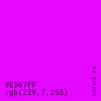 Цвет #E507FF в цветовой модели RGB обозначается тремя октетами (229, 7, 255) в десятичном формате и #E507FF в шестнадцатиричном (hex) формате, которые являются интенсивностью красного 229 (hex E5), интенсивность зелёного 7 (hex 07) и интенсивность синего 255 (hex FF).