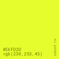 Цвет RGB(230, 253, 45) в процентом отношении количества цвета состоит из 90.2% красного (red), 99.2% зелёного (green) и 17.6% синего (blue).
