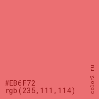 Цвет #EB6F72 в цветовой модели RGB обозначается тремя октетами (235, 111, 114) в десятичном формате и #EB6F72 в шестнадцатиричном (hex) формате, которые являются интенсивностью красного 235 (hex EB), интенсивность зелёного 111 (hex 6F) и интенсивность синего 114 (hex 72).