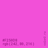 Цвет #F250D8 в цветовой модели RGB обозначается тремя октетами (242, 80, 216) в десятичном формате и #F250D8 в шестнадцатиричном (hex) формате, которые являются интенсивностью красного 242 (hex F2), интенсивность зелёного 80 (hex 50) и интенсивность синего 216 (hex D8).