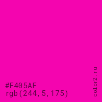 Цвет #F405AF в цветовой модели RGB обозначается тремя октетами (244, 5, 175) в десятичном формате и #F405AF в шестнадцатиричном (hex) формате, которые являются интенсивностью красного 244 (hex F4), интенсивность зелёного 5 (hex 05) и интенсивность синего 175 (hex AF).