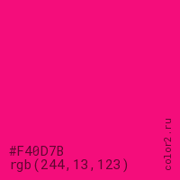 Цвет #F40D7B в цветовой модели RGB обозначается тремя октетами (244, 13, 123) в десятичном формате и #F40D7B в шестнадцатиричном (hex) формате, которые являются интенсивностью красного 244 (hex F4), интенсивность зелёного 13 (hex 0D) и интенсивность синего 123 (hex 7B).