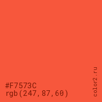 Цвет #F7573C в цветовой модели RGB обозначается тремя октетами (247, 87, 60) в десятичном формате и #F7573C в шестнадцатиричном (hex) формате, которые являются интенсивностью красного 247 (hex F7), интенсивность зелёного 87 (hex 57) и интенсивность синего 60 (hex 3C).