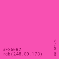 Цвет #F850B2 в цветовой модели RGB обозначается тремя октетами (248, 80, 178) в десятичном формате и #F850B2 в шестнадцатиричном (hex) формате, которые являются интенсивностью красного 248 (hex F8), интенсивность зелёного 80 (hex 50) и интенсивность синего 178 (hex B2).