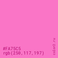 Цвет #FA75C5 в цветовой модели RGB обозначается тремя октетами (250, 117, 197) в десятичном формате и #FA75C5 в шестнадцатиричном (hex) формате, которые являются интенсивностью красного 250 (hex FA), интенсивность зелёного 117 (hex 75) и интенсивность синего 197 (hex C5).