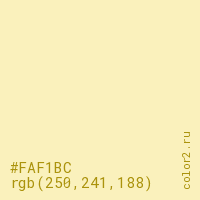Цвет #FAF1BC в цветовой модели RGB обозначается тремя октетами (250, 241, 188) в десятичном формате и #FAF1BC в шестнадцатиричном (hex) формате, которые являются интенсивностью красного 250 (hex FA), интенсивность зелёного 241 (hex F1) и интенсивность синего 188 (hex BC).