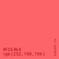 Цвет #FC646A в цветовой модели RGB обозначается тремя октетами (252, 100, 106) в десятичном формате и #FC646A в шестнадцатиричном (hex) формате, которые являются интенсивностью красного 252 (hex FC), интенсивность зелёного 100 (hex 64) и интенсивность синего 106 (hex 6A).