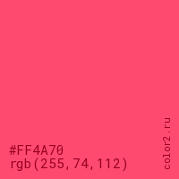 Цвет #FF4A70 в цветовой модели RGB обозначается тремя октетами (255, 74, 112) в десятичном формате и #FF4A70 в шестнадцатиричном (hex) формате, которые являются интенсивностью красного 255 (hex FF), интенсивность зелёного 74 (hex 4A) и интенсивность синего 112 (hex 70).